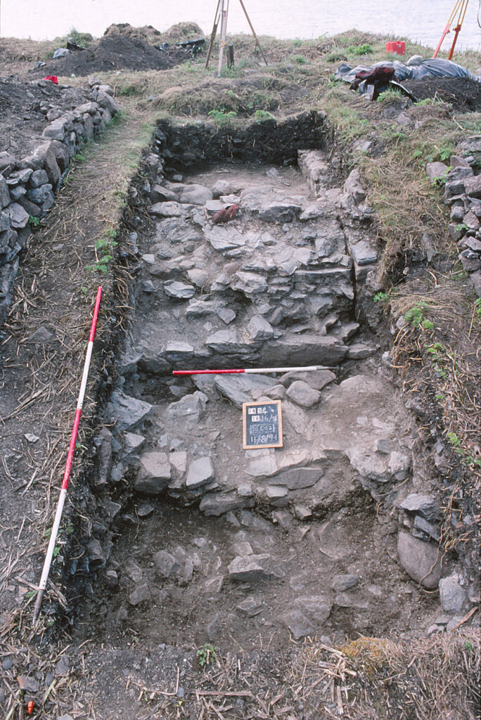 Finlaggan Castle excavation (1994): looking west  over  plinth  16062  and  castle  wall  16025B.  A  fragment of red sandstone marks the side of the much denuded castle entrance. Copyright David Caldwell