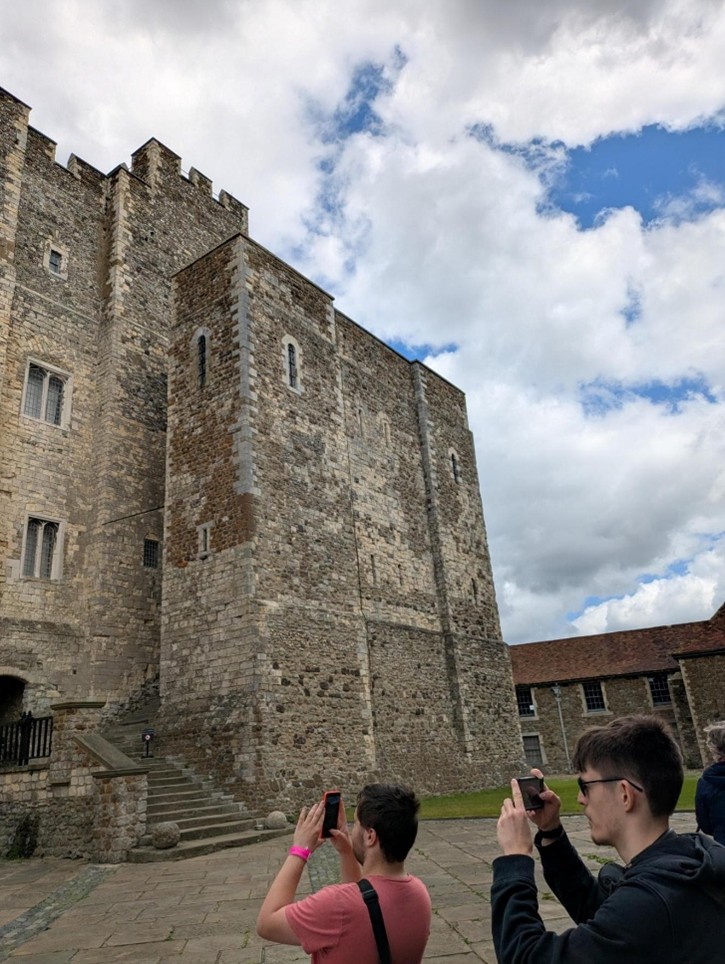 After the first co-design session our student interns, Ethan Serfontein and Joseph Seare, and Technical Lead, Mike Farrant, were invited to Rochester Castle by Dr Jeremy Ashbee, Head Properties Curator, English Heritage. Through visiting a similar structure, the team gained greater understanding of both the defining features of a Norman keep, and how we can draw evidence from the building to inform our reconstruction.