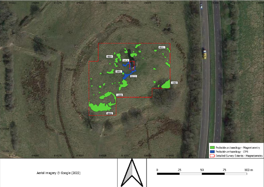 The results of the 2021 and 2022 geophysical surveys. Green indicates features identified through a magnetometer survey, and blue those found with ground-penetrating radar. The standing wall is roughly in the middle, and outlined by a red dashed box.